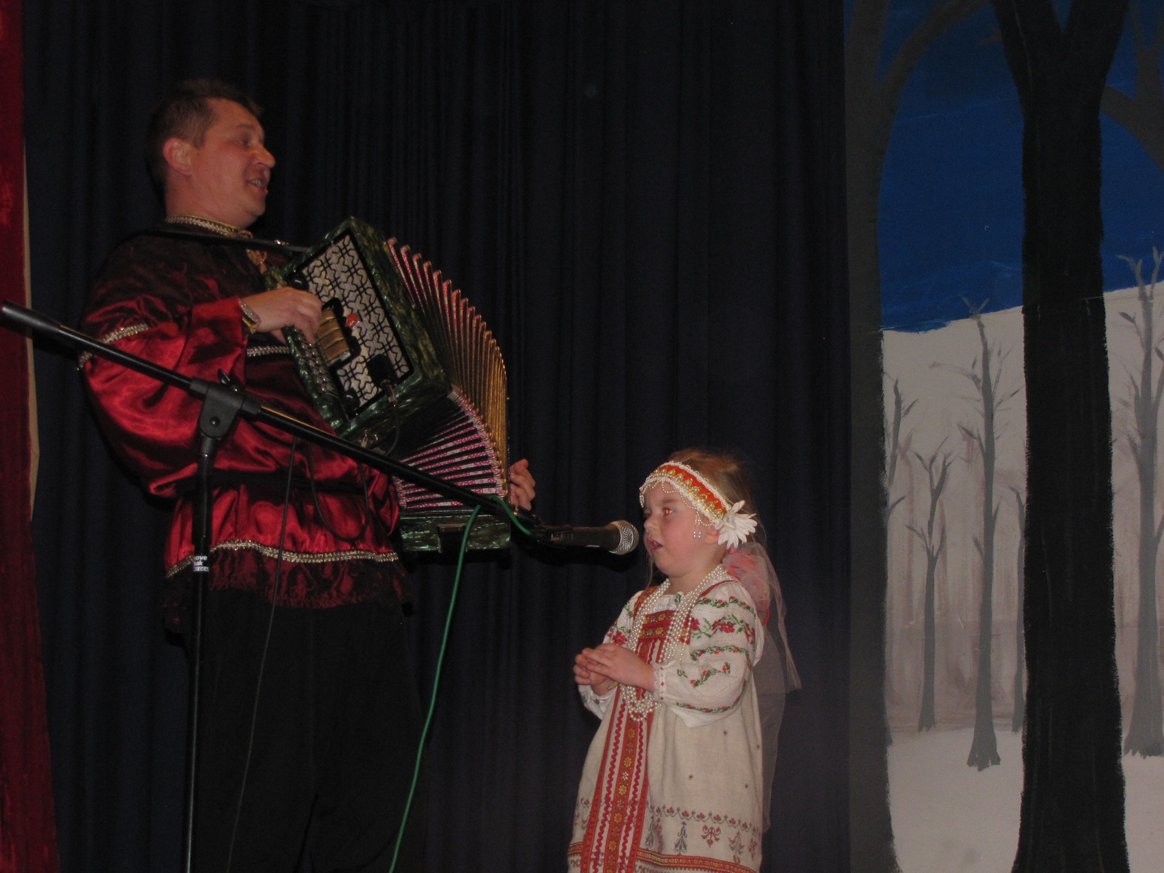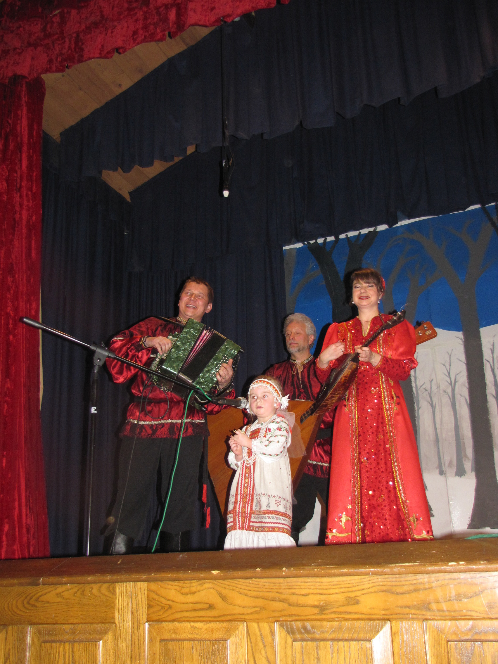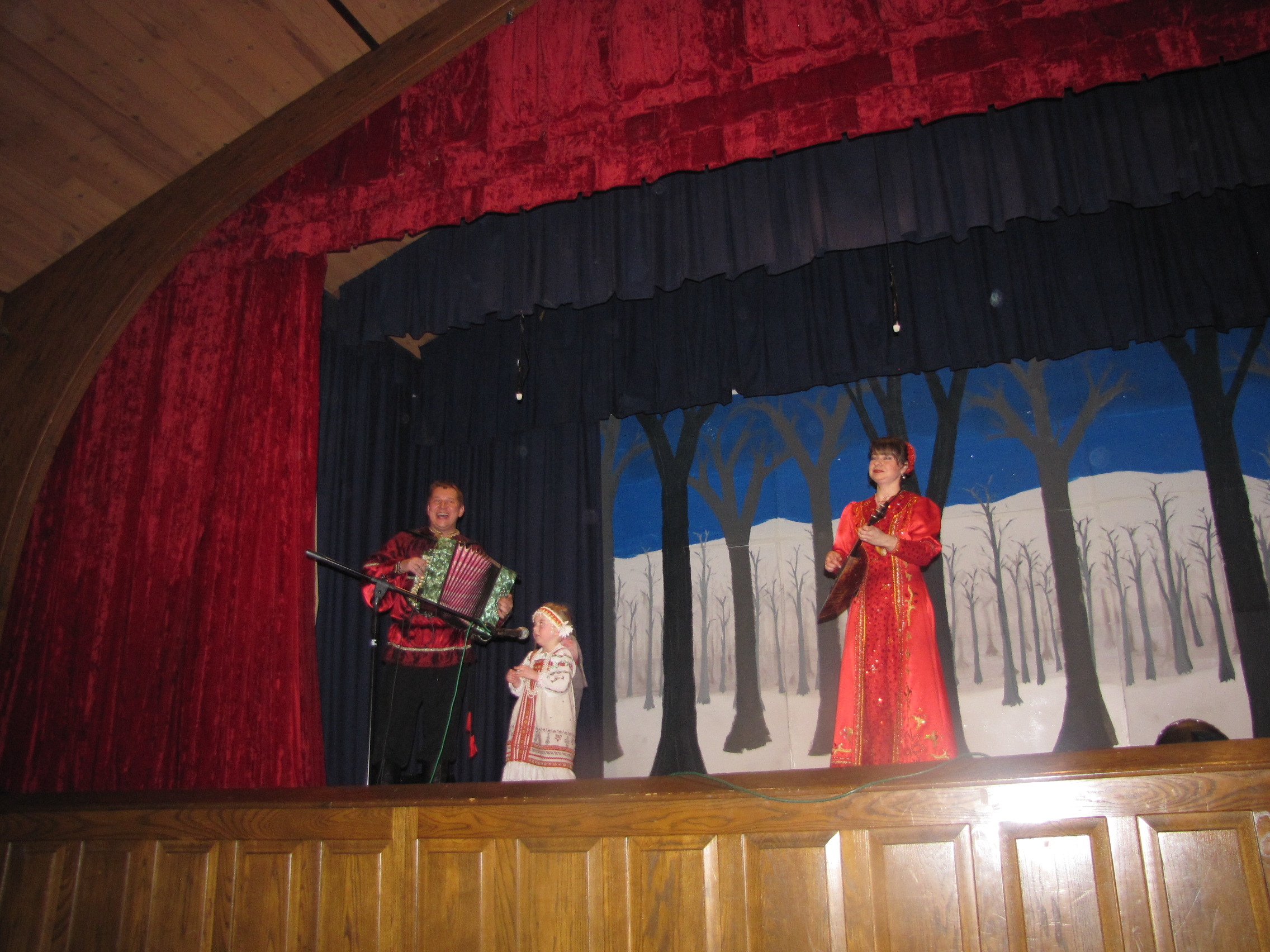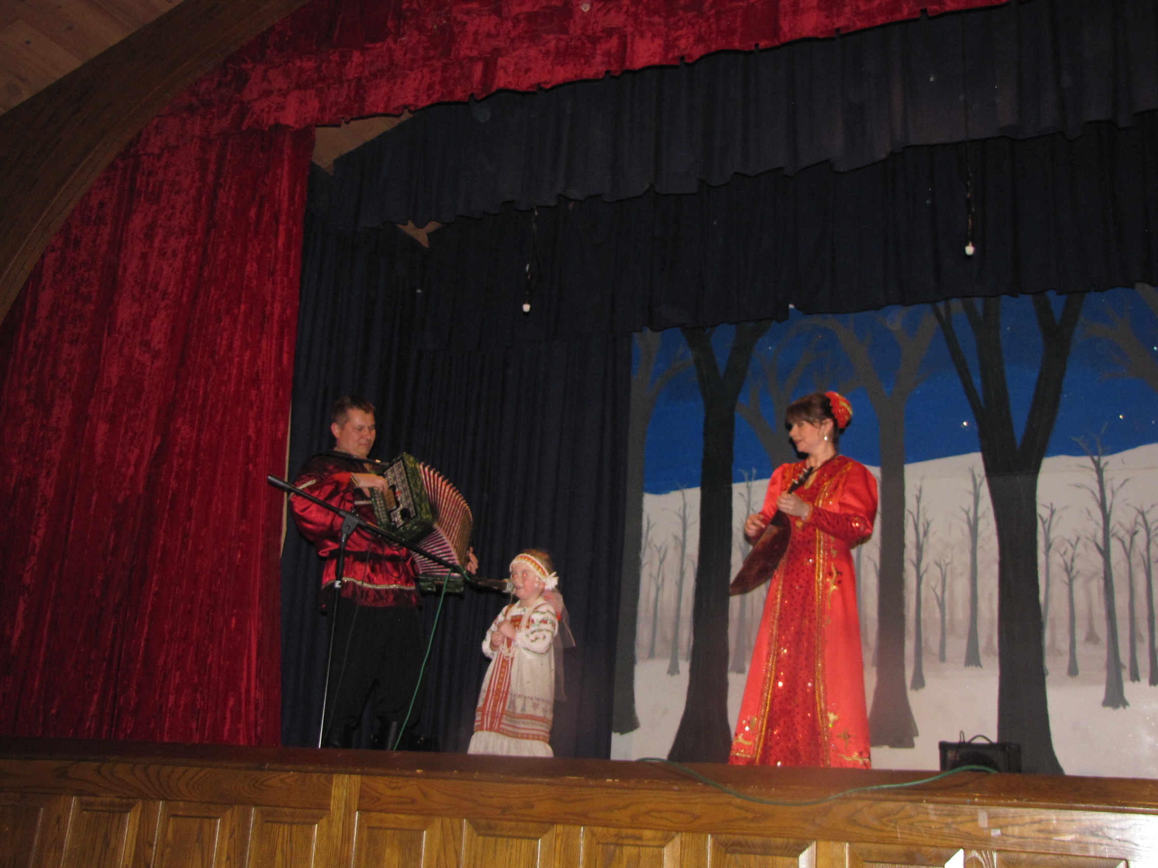 Leonid Bruk, Elina Karokhina and Mikhail Smirnov played balalaika, balalaika contrabass, guitar and garmoshka for about sixty minutes on the stage during dinner. The program of the performance included "Dark Eyes", "Moscow Nights", "Two Guitars", "Katyusha", "Kalinka", "Meadowlands", "The Long Road", and other Russian favoirite songs.
