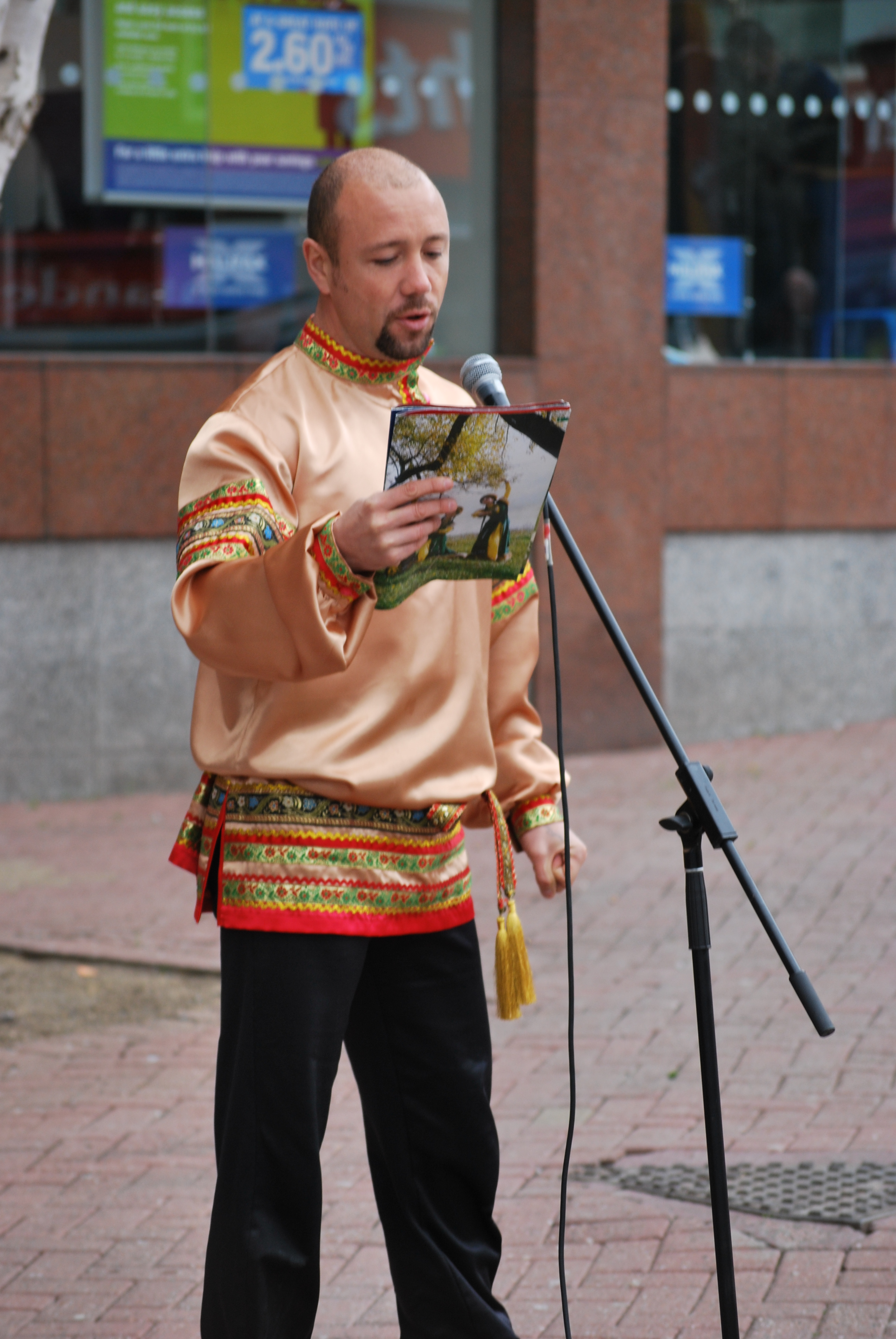 Boulat Moukhametov reading the introduction before Barynya dancers street performance series called "United Colours of Dance" during the International Dance Festival Birmingham (IDFB), UK. View all photos at www.flickr.com/idfb